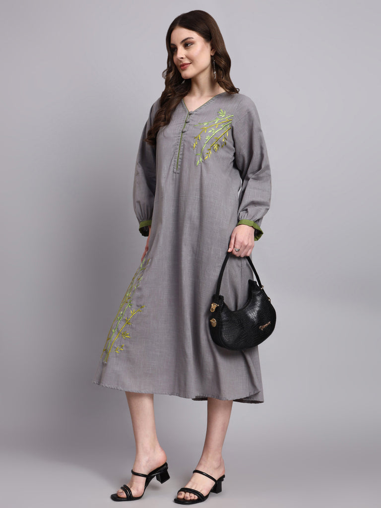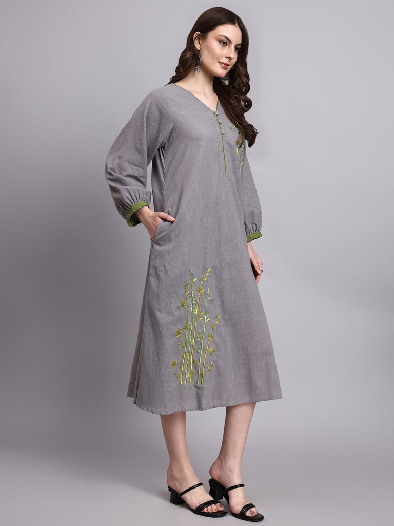 Made in breathable cotton slub with a refined linen-like texture, this grey dress is detailed with minimal Buddha bamboo embroidery, lending a calm, nature-led accent to its clean silhouette. Understated and versatile, Ira is perfect for effortless day wear with subtle handcrafted detailing.