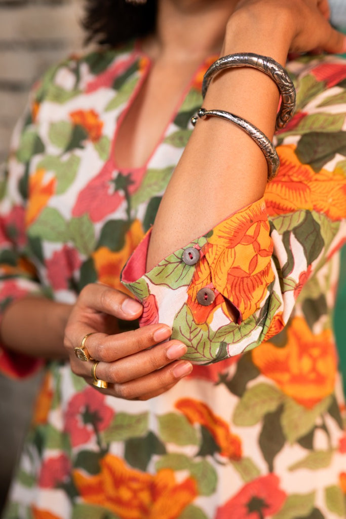 The Multicolored Bold Floral Cotton Kaftan Style Nightie is crafted from soft cotton with handblock floral prints in bright colors. It features a round notched neckline with contrast piping and three-quarter sleeves. A relaxed silhouette makes it suitable for nightwear or lounge wear.