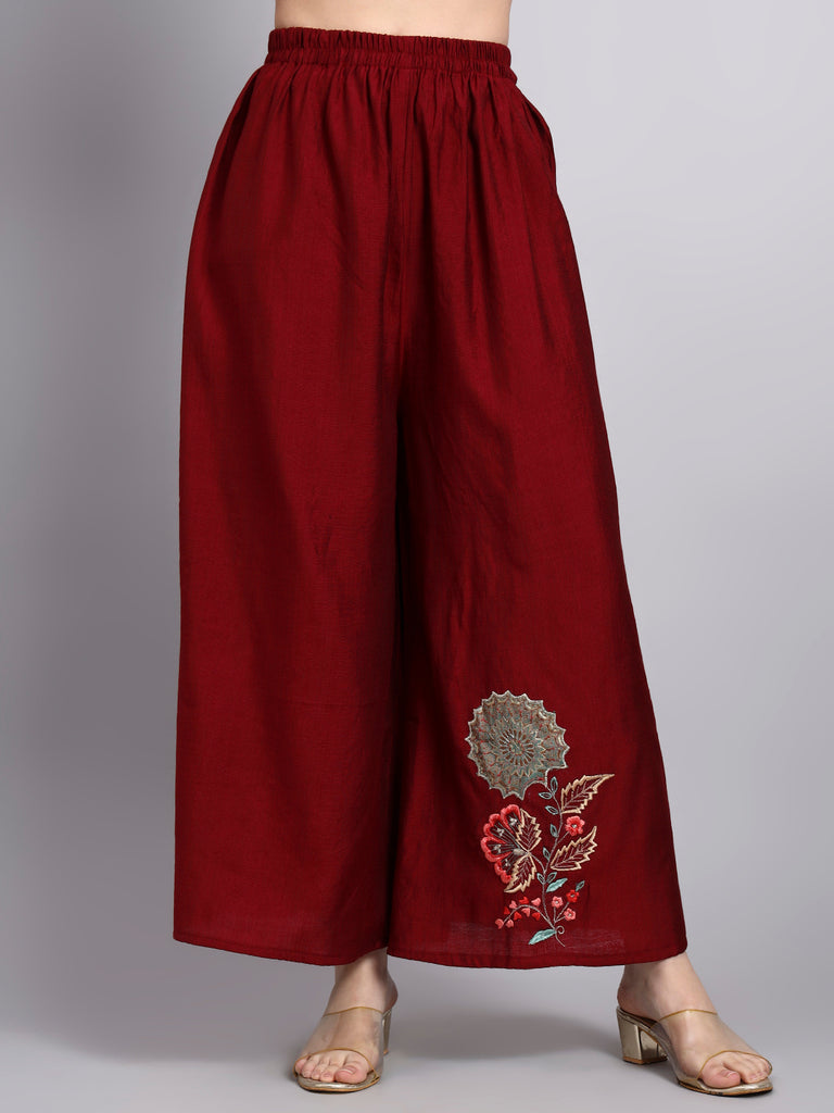 Paired with flared maroon pants featuring delicate embroidered details near the hem.