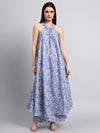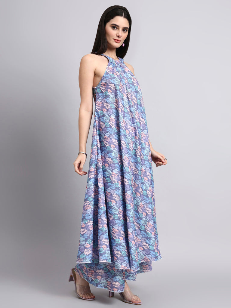 A breezy blue co-ord set featuring a halter-neck high-low kurta with delicate gathers.