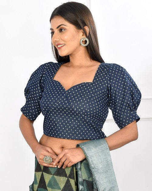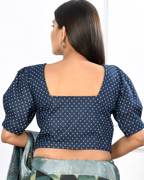 Featuring basic Blue printed Denim Blouse. Has puffed sleeves, sweetheart front neckline and square back neckline.