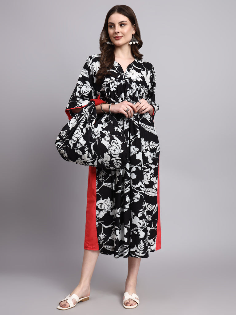 This black-and-white floral kafty offers timeless appeal with a modern edge. The contrast print feels bold yet elegant, making it a wardrobe staple that works across seasons.