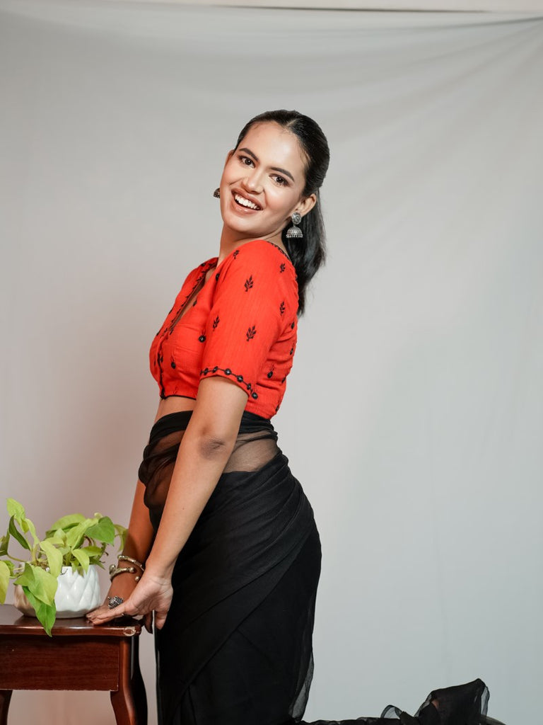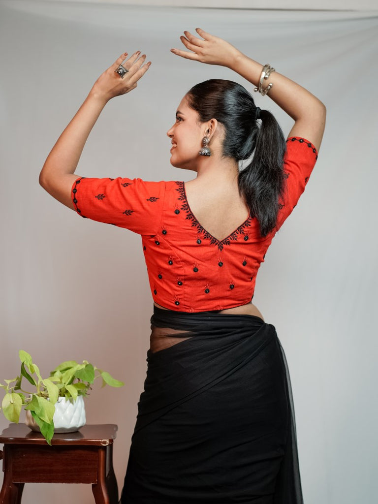 Featuring red mirror work embroidery Blouse with back open placket. A Blouse that can be mixed and matched with many contrasting solid colour or soft print Sarees. Machine embroidery