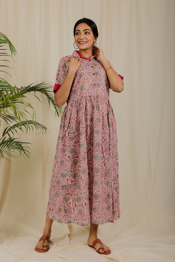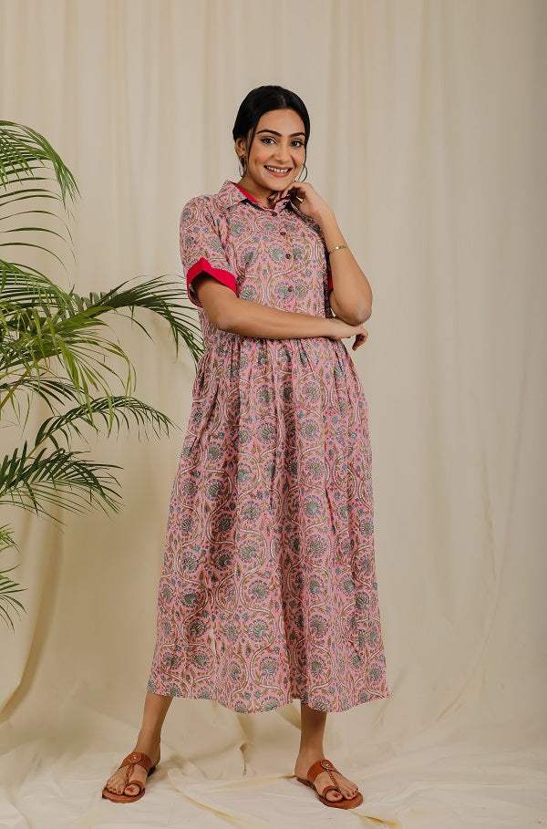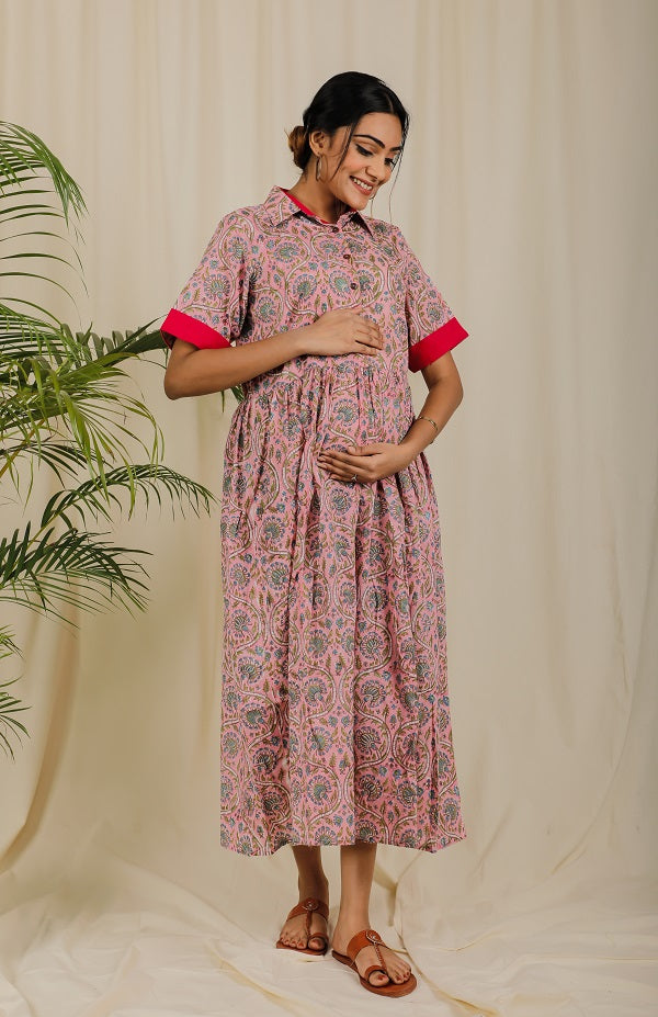 Blush Pink Floral Block Print Dress For New Mom Blush Pink Floral Block Print Dress For New Mom