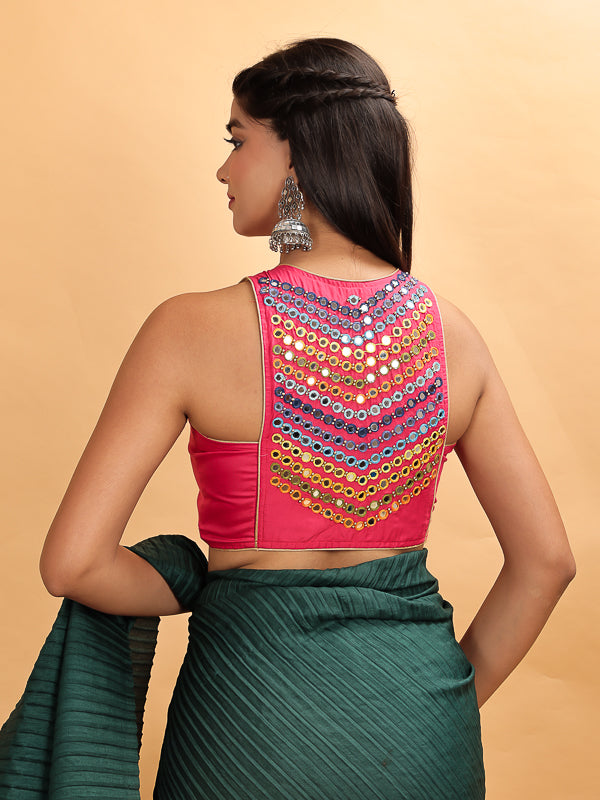 The sleeveless mirror work hand embroidery blouse features a halter neck and intricately embroidered mirrors in multicolour. The piece is suitable for mixing and matching with many sarees or outfits of your choice.