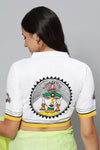 Featuring off white hand painted front open blouse with hand paint at the back .Pair this Blouse with a Black, Grey, Green, Red or White Saree and turn heads.The blouse has a comfortable fit to sail you through the day with ease.