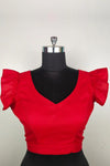 Featuring Red Cotton Blouse with rounded V front neck and a stylish button up back. The sleeveless cut is laced with ruffle.