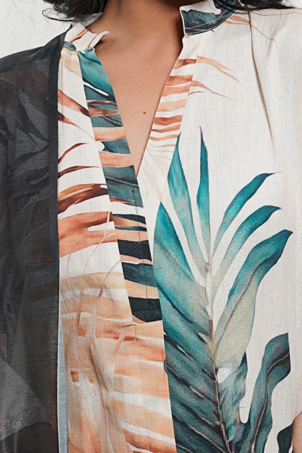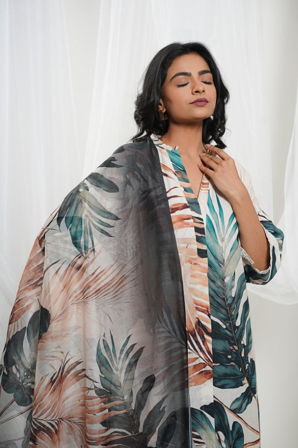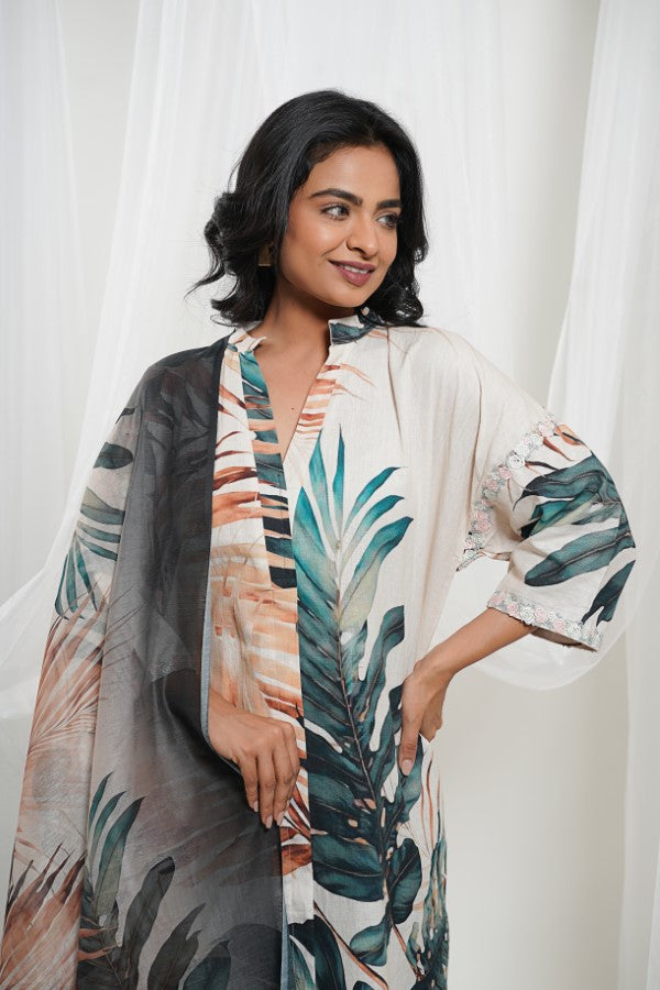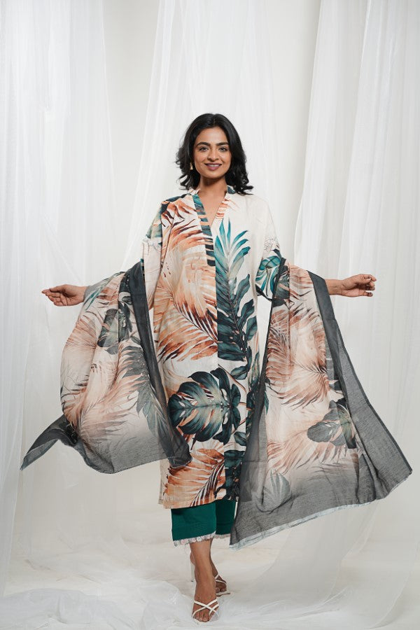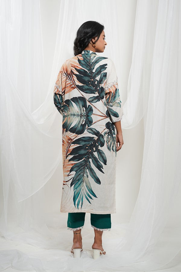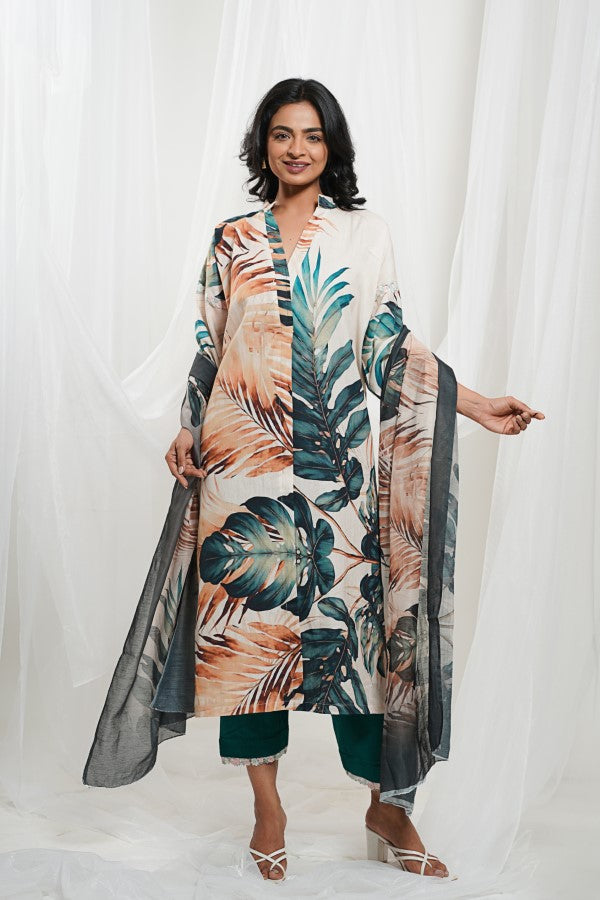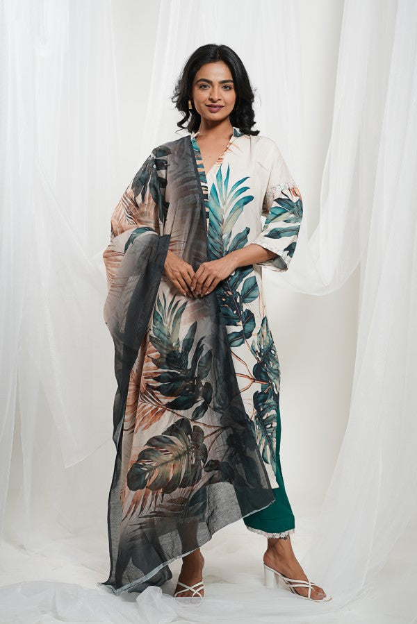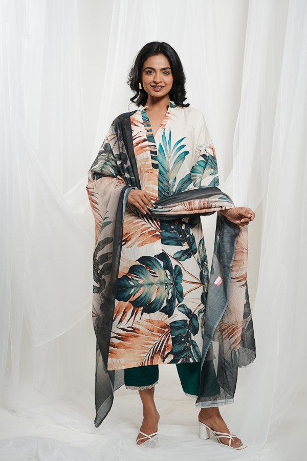 Beige Green Cotton Tropical Print Kurta Set Beige Green Cotton Tropical Print Kurta Set