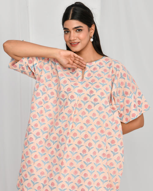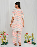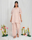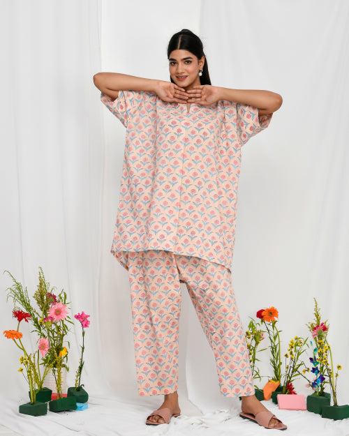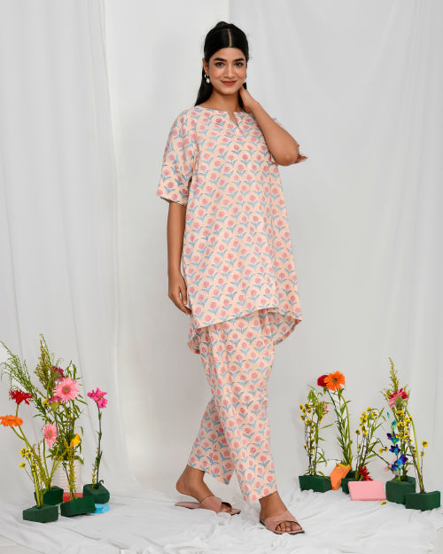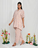 Cream Peach Floral Print Hand Embroidered Coord Set Cream Peach Floral Print Hand Embroidered Coord Set