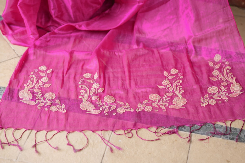 The striking hot pink hue radiates energy and joy, making it an eye-catching choice for any celebration. Adorned with exquisite beige floral appliqué embroidery, the intricate blooms add a touch of sophistication and contrast, creating a harmonious blend of warmth and vibrancy. Each floral detail is carefully crafted, showcasing the artistry and dedication behind this masterpiece.