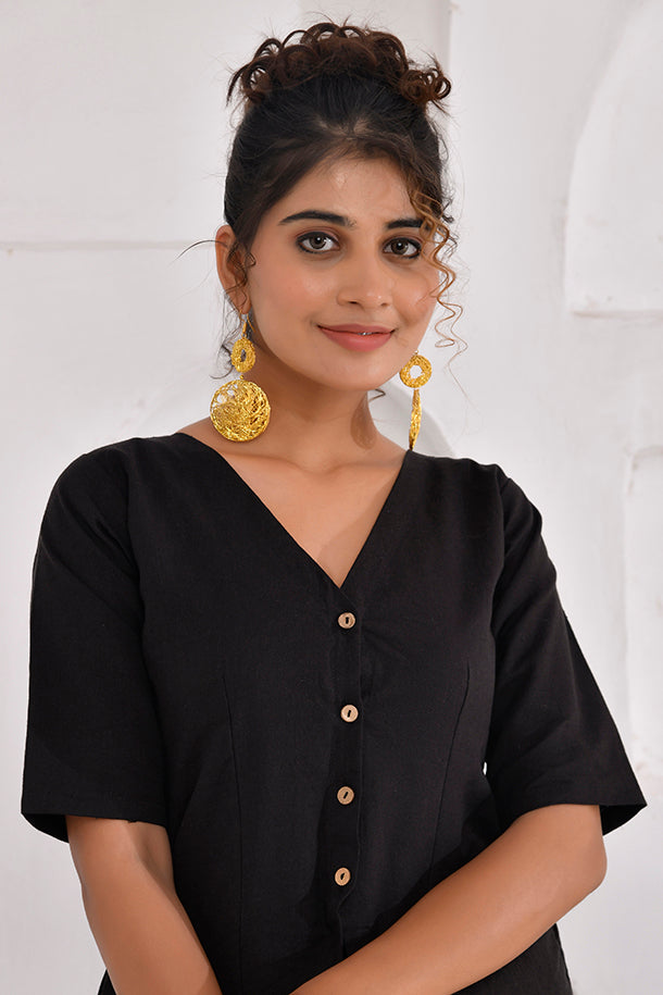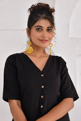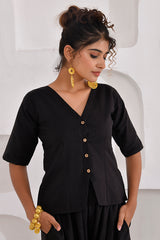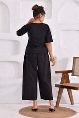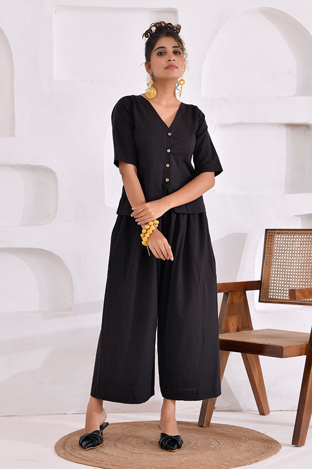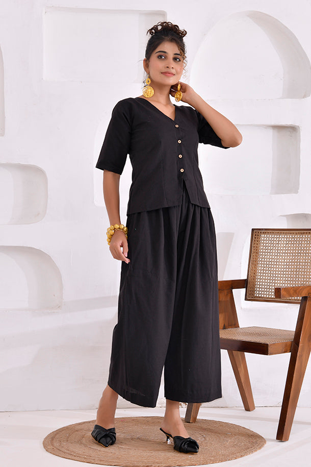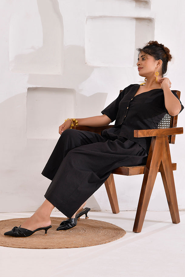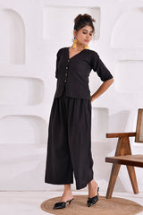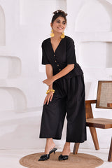 Add a touch of elegance to your wardrobe with this green co-ord set from The Saffron Saga's Vivid Vibes collection. This set features a short-sleeved top with a flattering V-neckline and a button-down front, paired with matching wide-legged pants that provide a comfortable yet chic fit. The deep Black color brings a sensual and vibrant feel, perfect for both casual and semi-formal occasions.