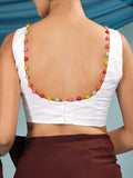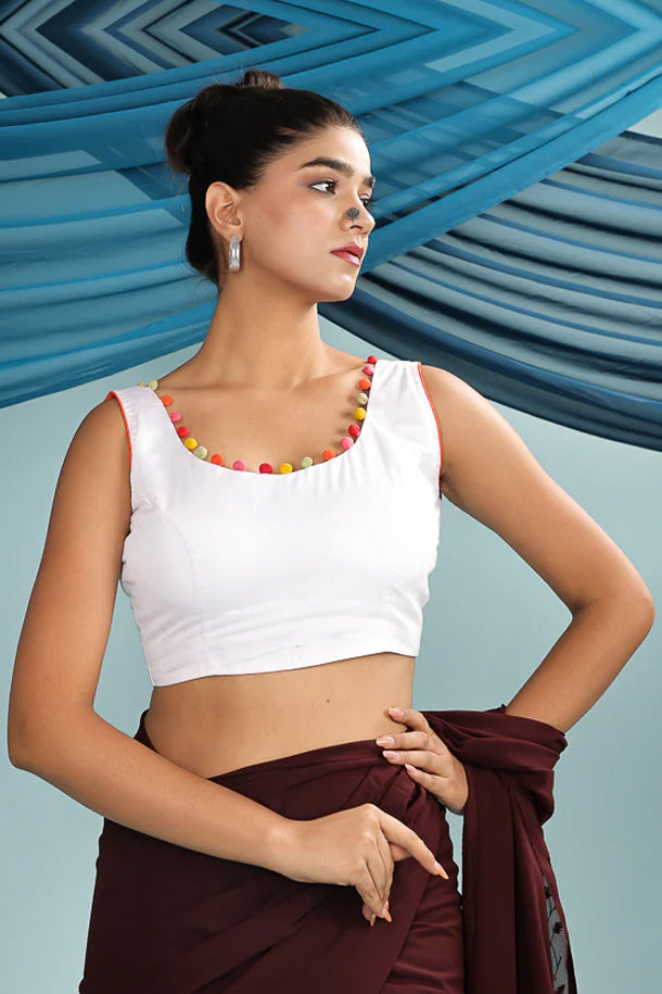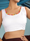 The blouse features a classic round neckline with full multicoloured pom pom laced over it, which makes the piece suitable for mixing and matching with many sarees or outfits of your choice.
