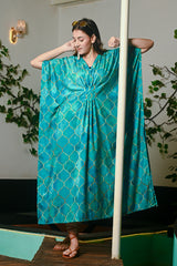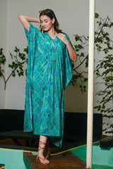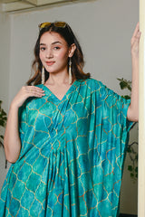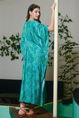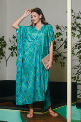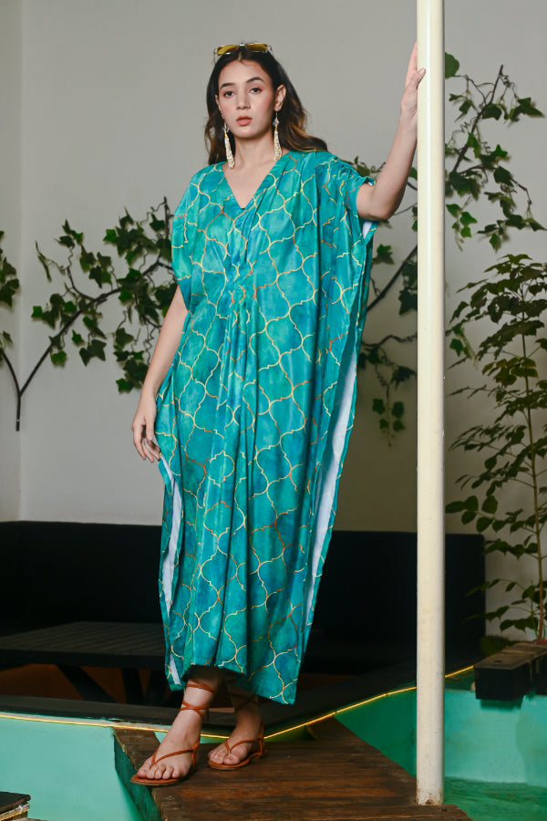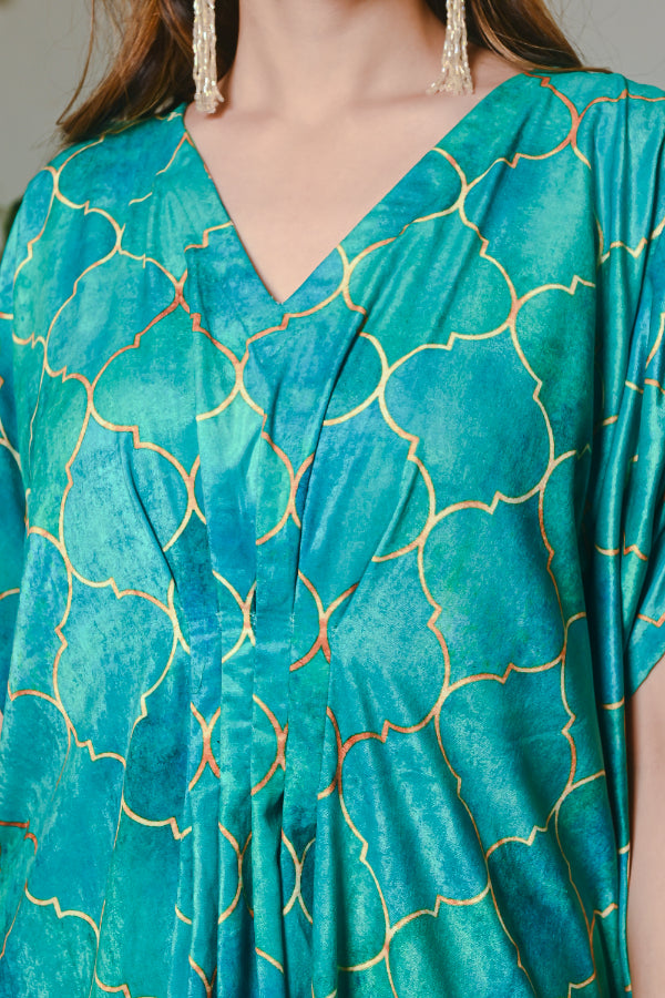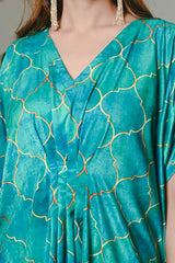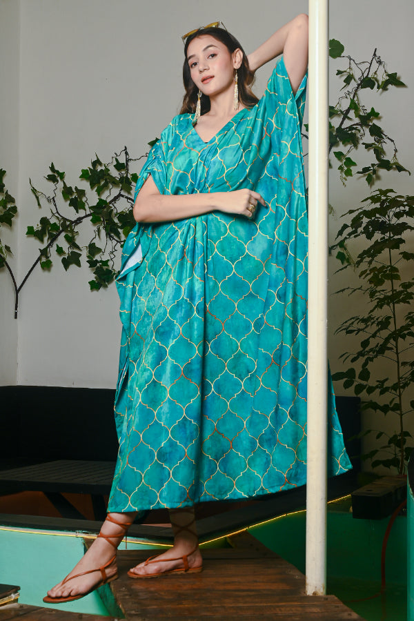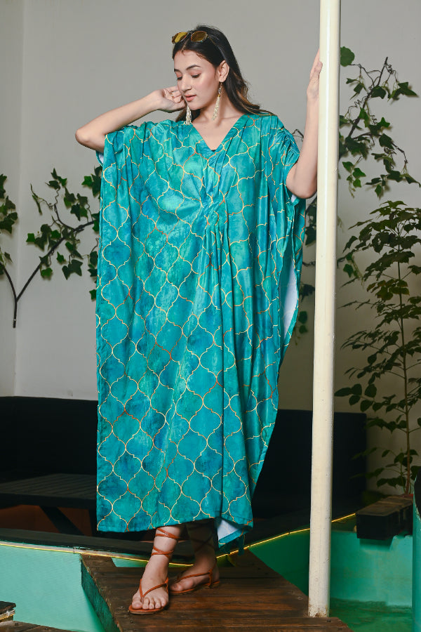 Sea Blue Moroccan Geometric Print Velvet Kaftan Sea Blue Moroccan Geometric Print Velvet Kaftan