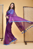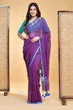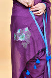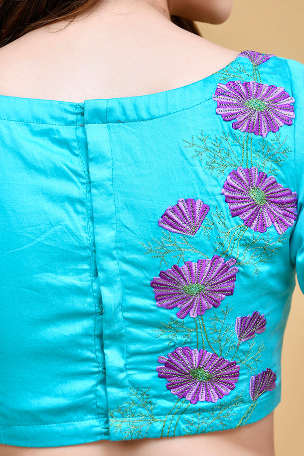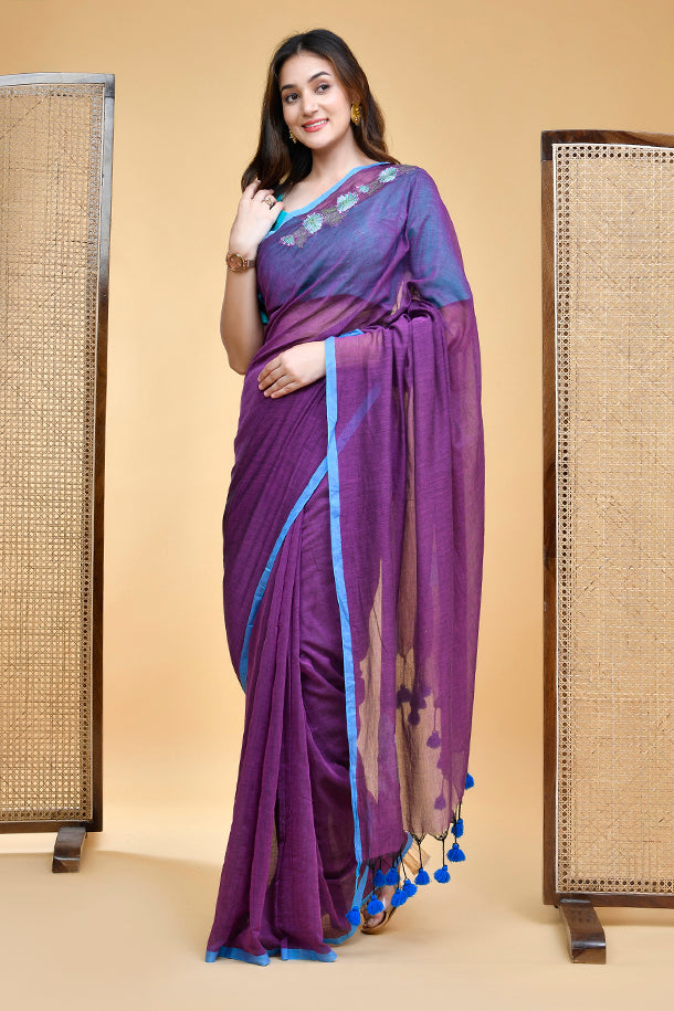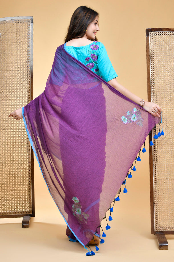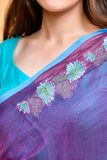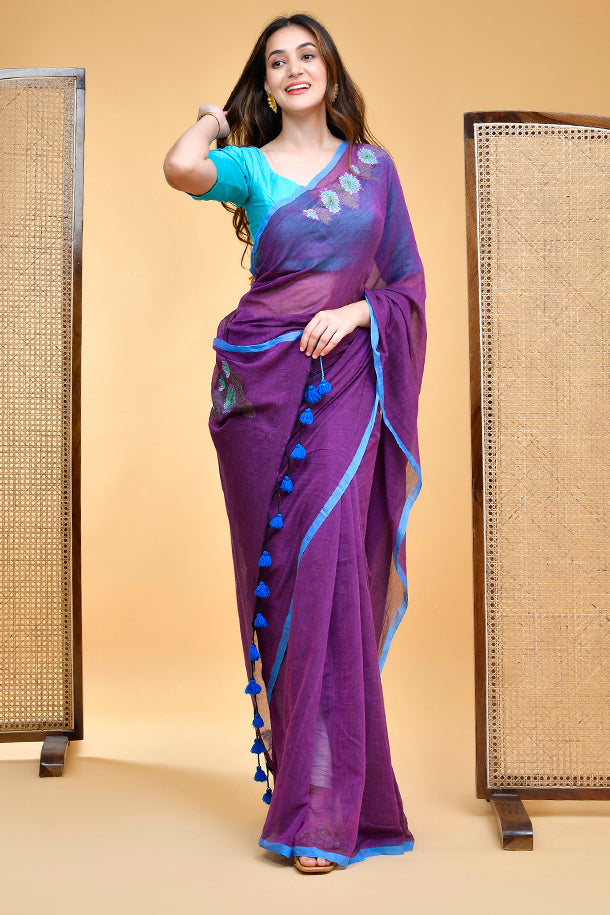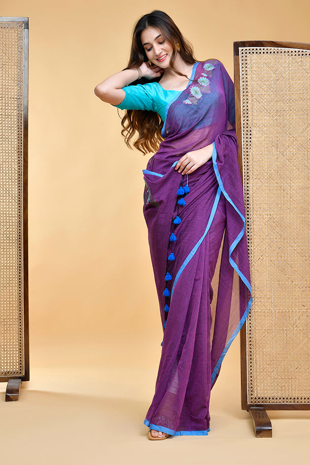 Stylish Mul Cotton Purple-Turquoise Embroidered Saree Blouse Set Stylish Mul Cotton Purple-Turquoise Embroidered Saree Blouse Set