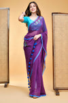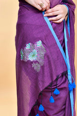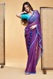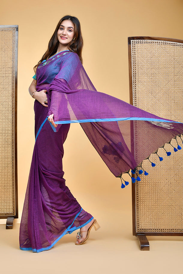 - Fabric & Colour: Made from lightweight mul cotton, the saree is designed for comfort and style. It features a deep purple base with a striking turquoise blue border that enhances the overall elegance of the ensemble.