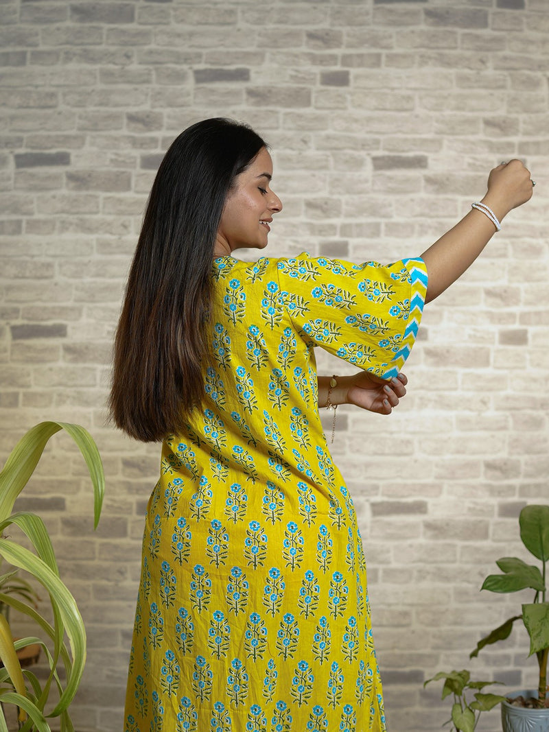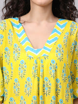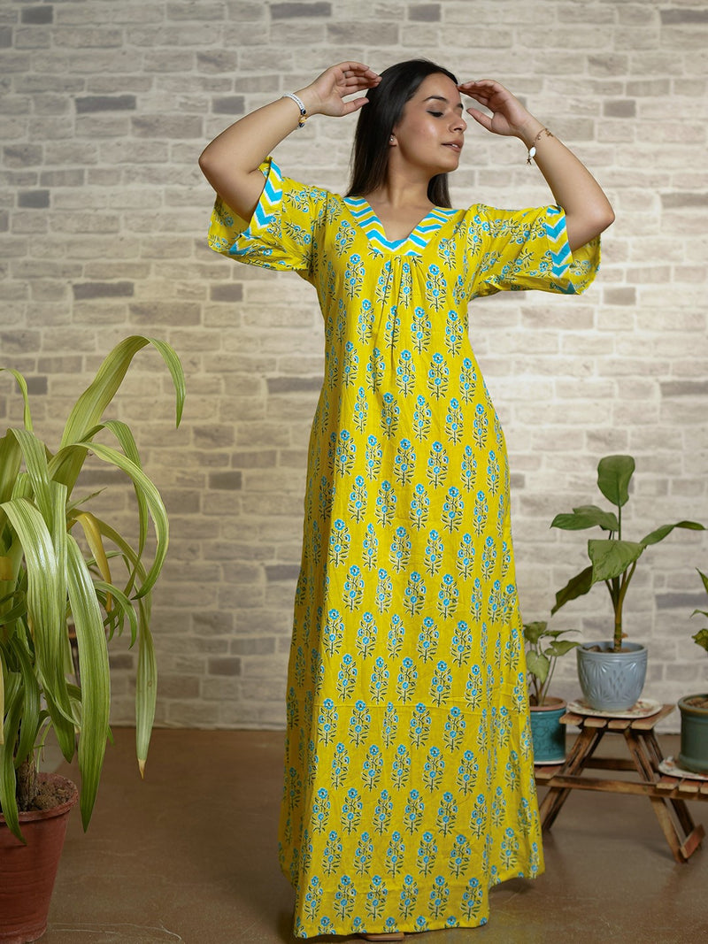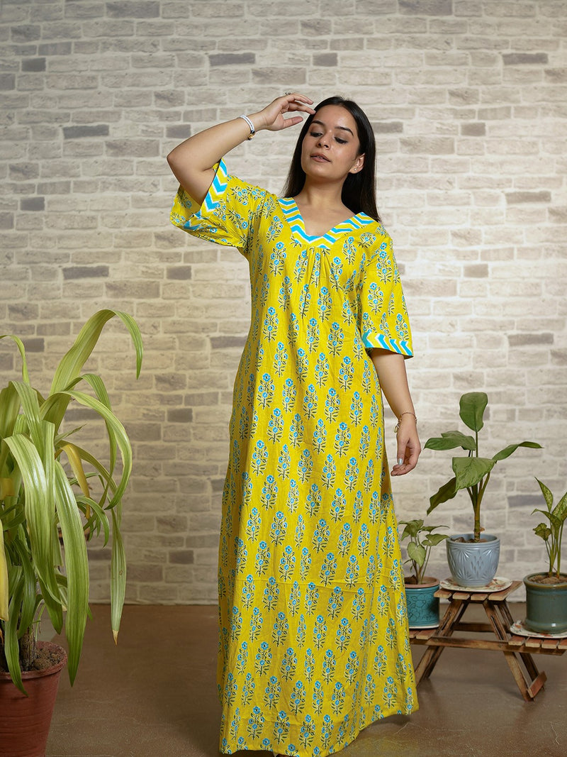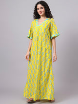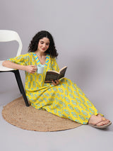 Brighten up your nights with this cheerful yellow cotton nighty, featuring a delicate blue floral print and stylish chevron-patterned accents on the V-neckline and flared sleeves. Crafted from breathable cotton fabric, this nightwear is designed for ultimate comfort while keeping you effortlessly stylish. The flowy silhouette ensures a relaxed fit, making it a perfect choice for both lounging and sleeping.