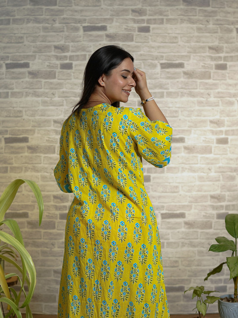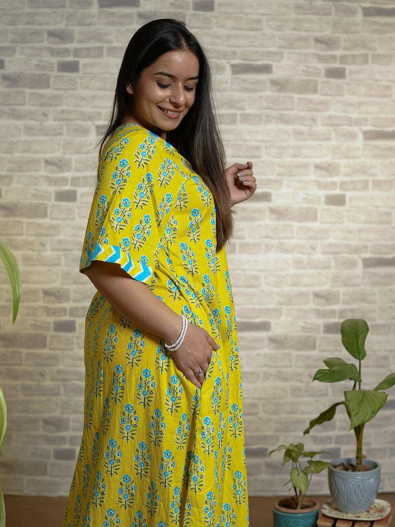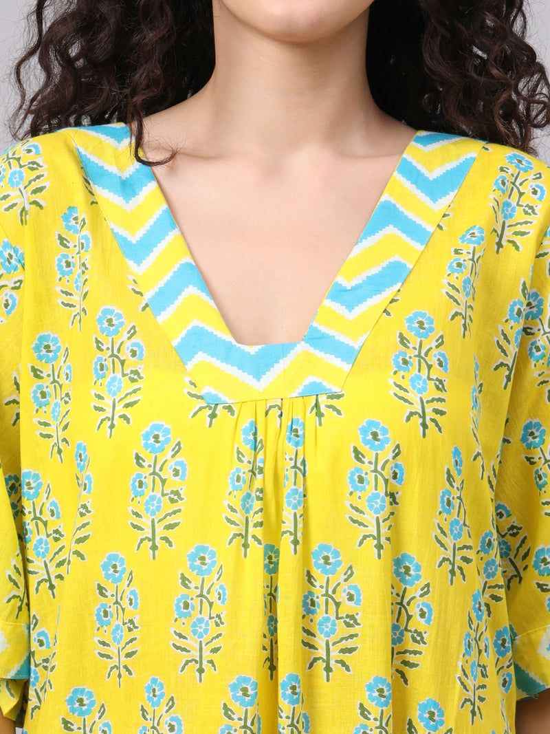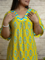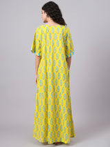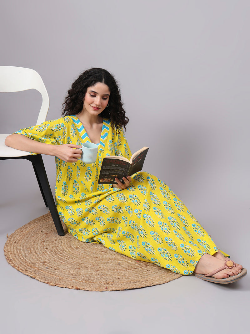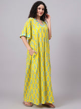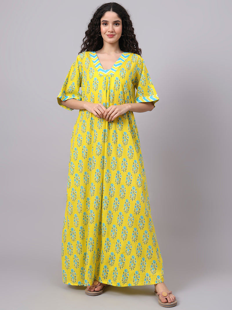 Yellow Floral Print Cotton Night Kafty with Flared Sleeves Yellow Floral Print Cotton Night Kafty with Flared Sleeves